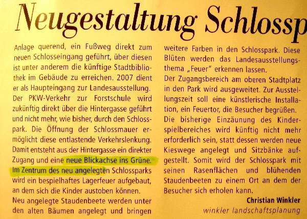 Es ist nicht alles erhaltenswert, nur weil es einige Generationen gewöhnt sind. Die unnütz gewordene Mauer des Schloßparkes ist so ein klassisches Thema. Wenn die WVP in ihrer Aussendung die Öffnung dieser Mauer in ihren Nachrichten nunmehr begeistert begrüßt, so ist ihr dies hoch anzurechnen. Es wäre aber sicherlich ein Nonsens, die übrigen Mauerteile jetzt kostenaufwendig zu sanieren und damit eine lächerliche „Zahnlücken“Architektur zu erlauben. Es gibt wohl nichts Unverständlicheres, als überflüssig gewordene "Einzäunungen mit Unterbrechungen" stehen zu lassen.